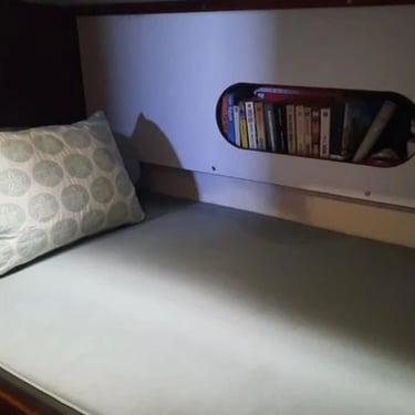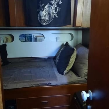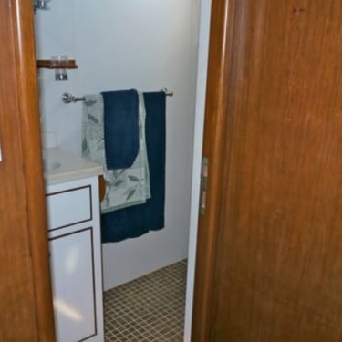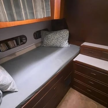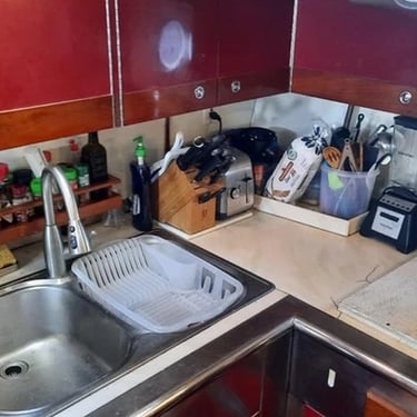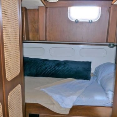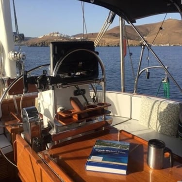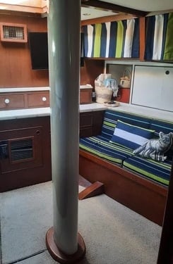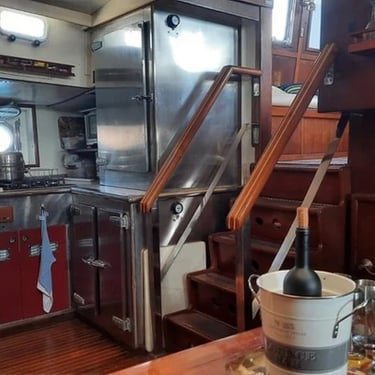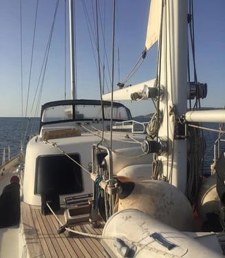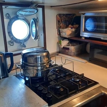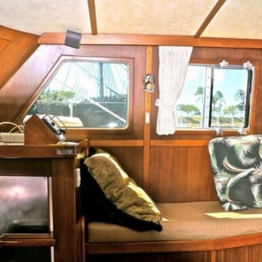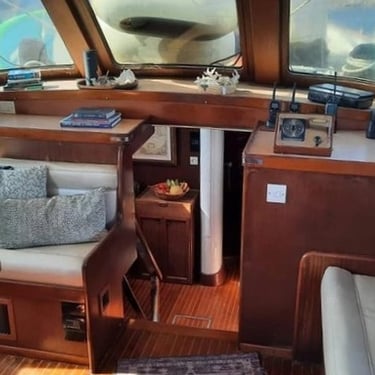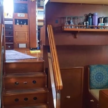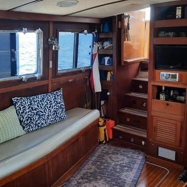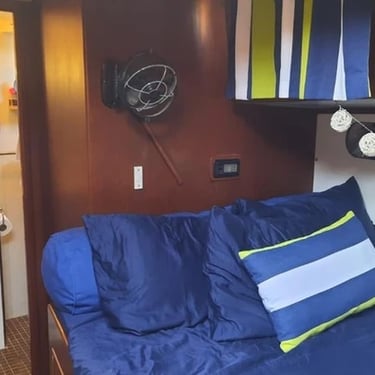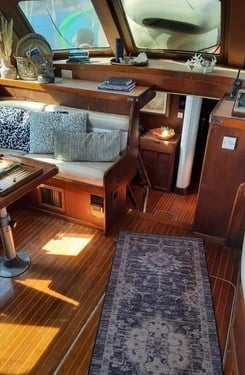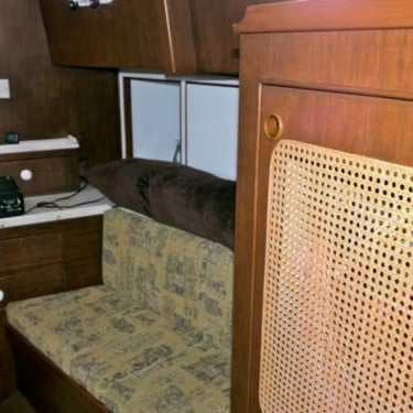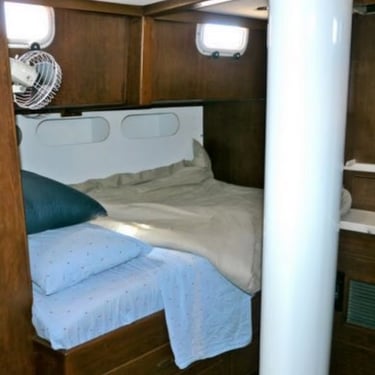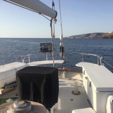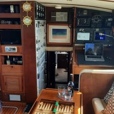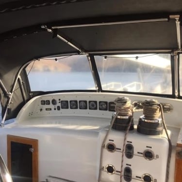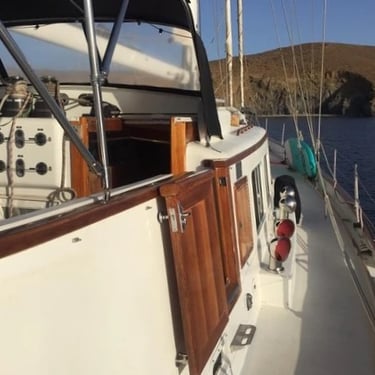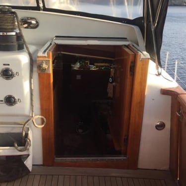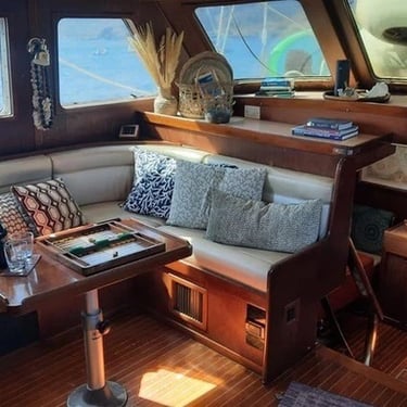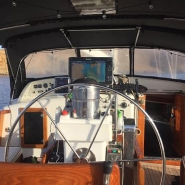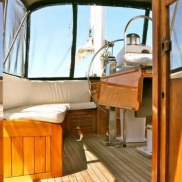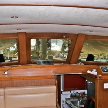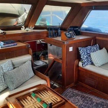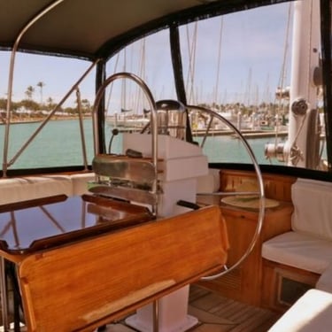 The center cockpit of this timeless yacht serves as both the heart and social hub, providing ample seating for up to 6 people to indulge in wining and dining. Whether it's a sunny day or wet weather, the enclosed area is equipped with shade cloth for warmth or isinglass panels for wet weather with Sunbrella covers as well.