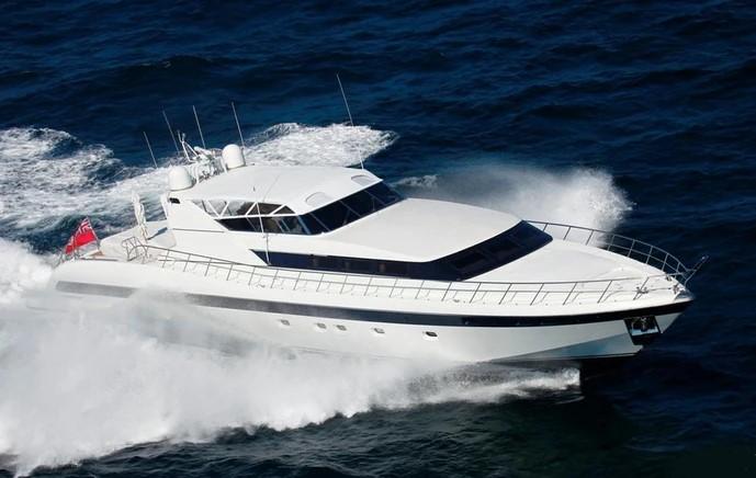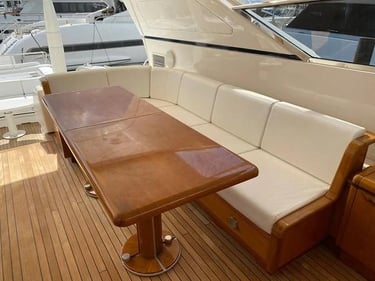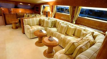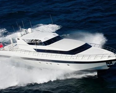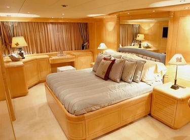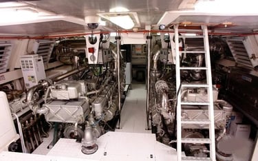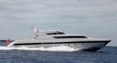 The 2001 105' Overmarine Mangusta is powered by twin 2700 hp MTU diesel engines with only 3100 hrs, giving her a maximum speed of 34 knots and a cruising speed of 30 knots by twin ROLLS ROYCE KAMAWA JET DRIVES. Engines and drives are synchronized to one unit; a simple one-handed twisting action steers the boat, with the throttle lever right at your fingertips. It is an extraordinary way to exercise control over such a powerful machine; it works beautifully and takes minutes to get used to. The 105 is superbly balanced, equally responsive to both throttle and helm, and is a joy to drive for something of this size and displacement. Minimum planing speed to be a comfortable 20 knots or so. At 25 knots the big Mangusta is relaxed in the cruise mode. Cruising is what the 105 is all about—with a generous fuel capacity it has nearly a 500NM range at 20 knots and not much less at 25. Top speed is 34 knots.