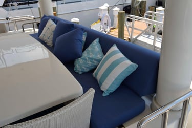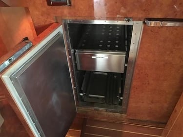 The salon is set up beautifully for entertainment and includes a day head. The massive aft teak cockpit has a hot tub, umbrella, garage door and swim ladder. The 105 is fitted with an impressive tonnage of entertainment equipment. Quality is exemplary. Interiors of lockers and drawers are as beautifully veneered and lacquered as the exteriors.