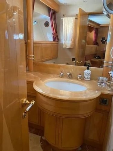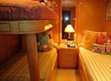 Below decks, the Mangusta 105 has a vast, ten-window owner’s cabin amidships, a VIP suite in the bow, and twin-berth guest en suites to port and starboard. The motor yacht can accommodate 8 guests in 4 cabins. Headroom through the lower accommodation is an impressive 6'8", and the berths are all full size—even the singles are 30 inches wide. The aft crew accommodations are roomy and comfortable, with a pair of twin-berth en suites and a generous galley.
